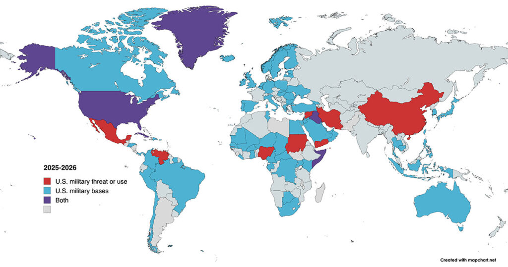 The United States itself is colored purple because U.S. troops have been deployed on U.S. streets in the form of the so-called National Guard, as well as ICE, Border Patrol, and various other militarized agencies, plus the threat of the U.S. Army.