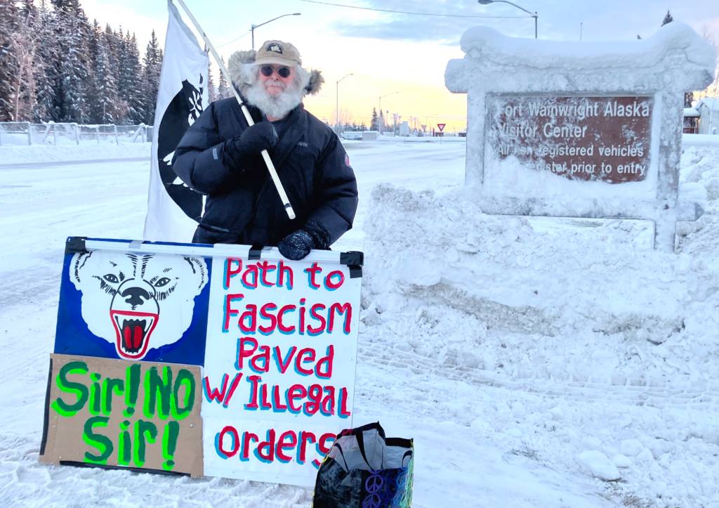 FAIRBANKS AK – Some 1,500 paratroopers from the Army’s 11th Airborne Division at Fort Wainwright are on standby for immediate deployment to Minneapolis. Many of them will have seen the signs and read the flyers a military veteran has taken to base gates since July 2025, telling them “REFUSE ILLEGAL ORDERS. IT’S THE LAW AND OUR DUTY!”, “THE PATH TO FASCISM IS PAVED WITH ILLEGAL ORDERS!” and “SIR, NO SIR!” the title of a documentary about GIs who refused to fight in Viet Nam.