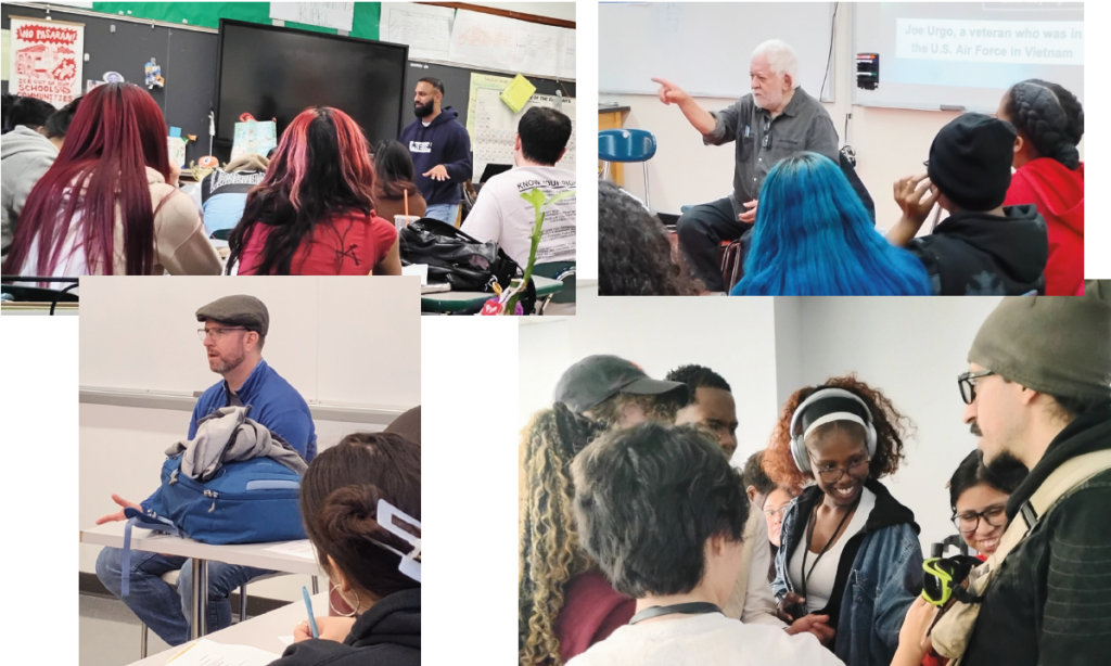 Our ground-breaking panel of a dozen veterans – from Vietnam to Afghanistan to the global network of U.S. bases maintaining U.S. imperialist domination – visits classrooms to share what recruiters won’t — the real cost of war: John Burns, Ross Caputi, Joy Damiani, Rosa del Duca, Will Griffin, Chris “Henri” Henrikson, Miles Megaciph, Lyle Rubin, Brian Teucke, Shaniyat Turani-Chowdhury, Joe Urgo and Miguel Gabriel Vazquez. We provide the space for honest dialogue, critical thinking and informed decision-making. These men and women, English- and Spanish-speakers, tell the hidden stories, bringing living history to high school and college students. Your donation keeps us in schools across the country.
